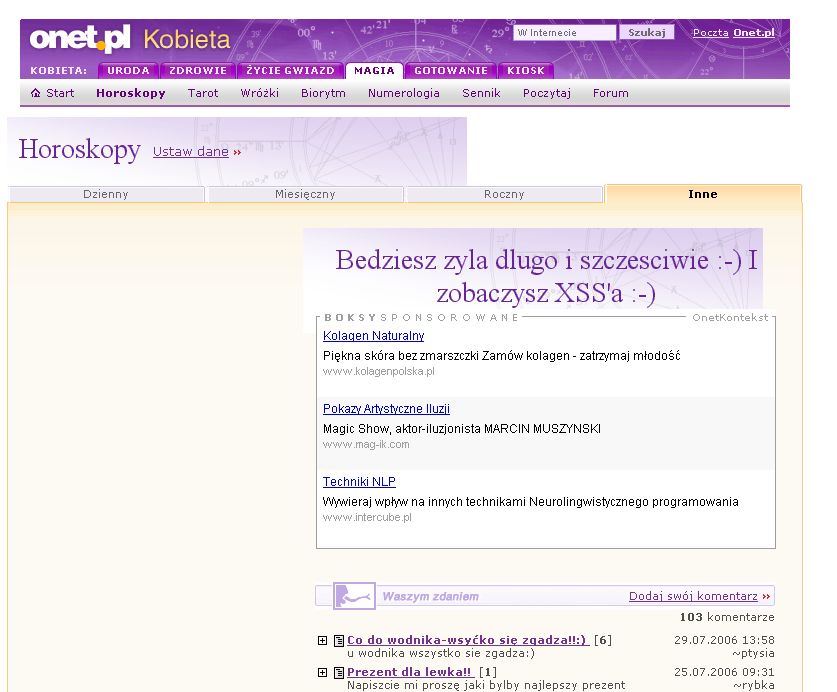 Tak jak wspominałem większe i większość serwisów wchodzących w skład Onetu jest podatnych na XSS. Poniżej kilka screenów z serwisu dla kobiet.