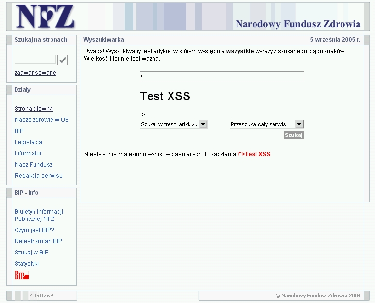 Przykładem ufności do użytkowników może być strona Narodowego Funduszu Zdrowia (http://www.nfz.gov.pl/). Najbardziej podatnym elementem stron są wszelkie formularze, na stronie NFZ rzuca nam się od razu w oczy wyszukiwarka. Wyszukiwarka ta nie filtruje danych, które otrzymuje od użytkownika co skutkuje możliwością wstrzyknięcia kodu HTML oraz JavaScript.
