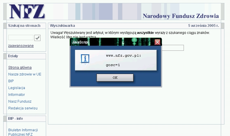 Wcześniejszy przykład ukazywał‚ idee wstrzyknięcia kodu HTML, co jednak gdy agresor użyje JavaScript, który ma zdecydowanie większe możliwości? Powróćmy do wyszukiwarka NFZ, gdy dokonamy modyfikacji