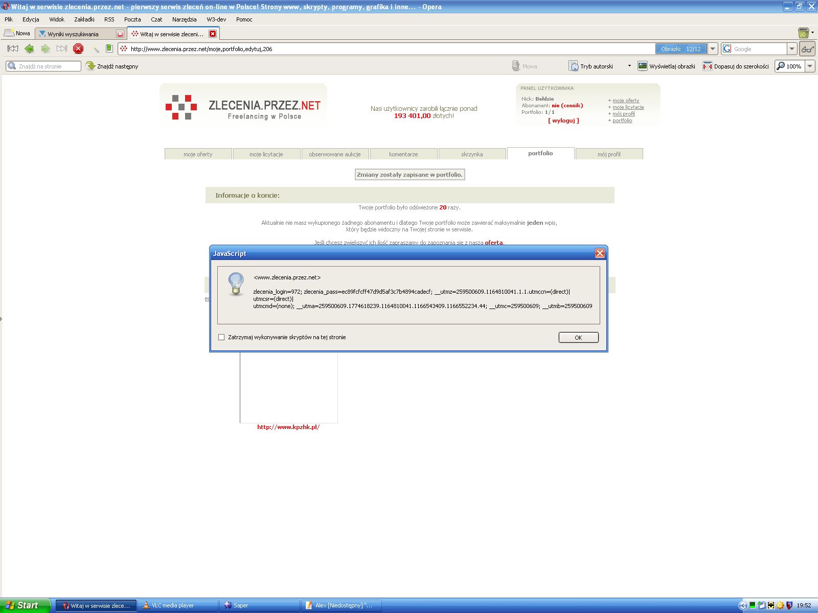 Po dokładniejszym przyjrzeniu się danym zapisanych w ciasteczku można wywnioskować, że zmienna „zlecenia_haslo” nie jest dokładnym hashem hasła użytkownika przez co NIE MOŻNA bezpośrednio wyciągnąć danych użykownika. Chciałem przeprosić właścicieli serwisu zlecenia.przez.net za ten błąd.